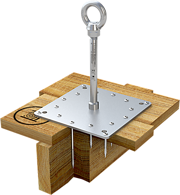 Bevestigd met 2 lange schroeven in de dakbalk en 14 schroeven direct op het houten dakbeschot beveiligt dit rvs ankerpunt (Ø 16 mm) met grondplaat (200 x 200 mm) dakwerkers en anderen. Met algemene Goedkeuring bouwtoezicht van de DIBt.